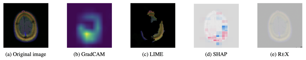 ‘Explaining’ the absence of disease. Common XAI tools will produce heatmaps, ostensibly locating to where there is no tumour. But this entire brain slice is absent of any tumour. Arguably, ReX has the most ‘informative’ landscape as it is utterly uninformative (i.e. nearly completely flat), though this is not clinically useful.