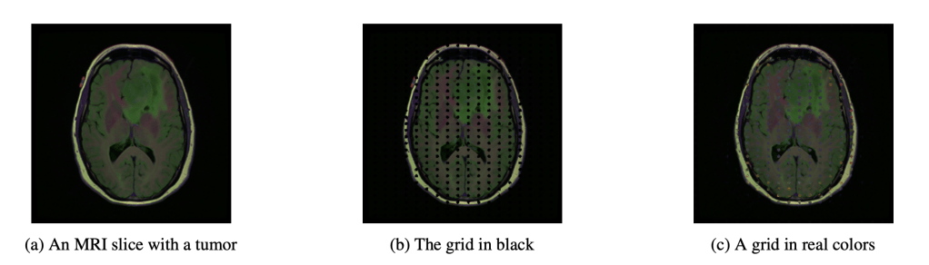 It is important that the grid values themselves do not cause the classification of a tumour. This might be some healthy value or neutral value interpolation (like black or grey – which are not a natural colour in these images – which although not healthy, neither is it diseased).